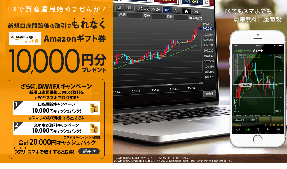 DMM FXの限定キャンペーンの紹介です。 新規口座開設後の初回入金&初回取引でもれなく30,000円相当をプレゼント 口座開設後の取引で10,000円キャッシュバック&10,000円分のAmazonポイントプレゼント さらにスマホでの取引で10,000円キャッシュバック!! 計30,000円相当がもらえますよ。 お得なキャンペーンですので、本ページのリンクからアクセスしてみてください 業界最安水準のスプレッドに加え、PC、スマホでの簡単取引アプリ、大手SMBC信託銀行との連携、24時間電話サポート等と安心して取引できますよ。 ...