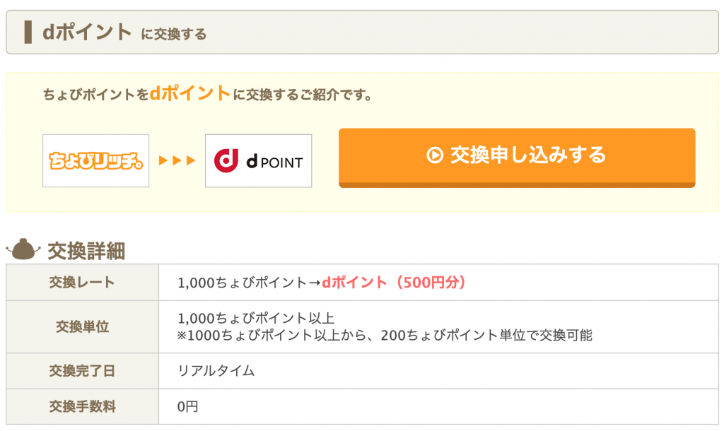 お久しぶりの更新になっちゃいました。 またちょこちょこ更新していきますので、よろしくお願いします。 ちょびリッチで貯めたポイントをdポイントに交換できるようになりましたよ! 詳細はこんな感じです↓ ---------- ・交換レート 1,000ちょびポイント(500円相当)→500dポイント(500円相当) ・交換単位 1,000ちょびポイント以上 ※1000ちょびポイント以上から、200ちょびポイント単位で交換可能 ・交換完了日 リアルタイム ...