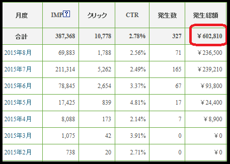 JUGEMテーマ:☆☆自宅でお小遣い稼ぎ☆☆ いつもご覧頂きありがとうございます^^管理人のみっふぃーです♪8月は、7月の成果数の約半分ではありますがそれでも着々と成果を上げているi-mobile for AFです。発生件数に関わらず1件1件に感謝を忘れないようにしています^^そして、ハッと気づいたらi-mobile for AFの成果が60万円を突破していましたΣ(゚д゚lll)ビックリンチョ合計成果額が【602,810円】(;゚Д゚)!!!これは一つのサイトでの合計で他に登録してあるサイトにて5,600円の成果が発生しているので正確には【608,610円】の成果合計...