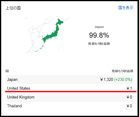 JUGEMテーマ:☆☆自宅でお小遣い稼ぎ☆☆ まさか日本以外にお住まいの方から成果が発生するとは思っていませんでした!!と言っても「見積もり収益」なんですけどね。「United States」って・・・アメリカですよね(;´д`)?海を超えた所に住まわれている方にも私のサイトを見ていただけているなんて改めてインターネットの力を感じ、そして感謝致します。ついでに調べてみたんですが、アメリカ以外にもいろんな国から私のサイトを見てくださっている方がいらっしゃるようです^^「たまたまネットサーフィンをしていて表示され...