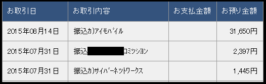 JUGEMテーマ:☆☆自宅でお小遣い稼ぎ☆☆ -------------------------------------ランキングに参加しています。応援よろしくお願いします! --------------------------------------お盆真っ只中、皆さんいかがお過ごしでしょうか。我が家は昨日一日でお盆の来客と実家への挨拶を済ませあとは自由なので遊びに行く予定です♪さてさて何が入金されたかと申しますとあのi-mobile for AFの報酬です!!!一番上にしっかり「カ)アイモバイル」ってあります!!今回は31,650円の入金です。ちなみに振込手数料等で250円引かれています。他にも7...