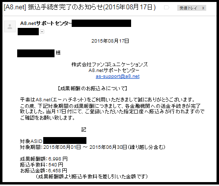 JUGEMテーマ:☆☆自宅でお小遣い稼ぎ☆☆----------------------------------応援クリックよろしくお願いします!-------------------------------------A8.net に登録して約2年!初めて報酬の振込がありました!!!A8.net よりメールが来ました^^振込み金額は6,458円でした^^振込人は「ファンコミュニケーションズ」です。苦節2年(>_<)ク〜〜ッ!ほとんどがセルフバックの成果なんですがそれでも振込があるというのは本当に嬉しいことですね^^口座の残高も着々と増えています♪先日中は口座の残高がカツカツで携帯電話の使用...