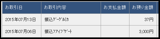 JUGEMテーマ:☆☆自宅でお小遣い稼ぎ☆☆ すみません!できれば最初に応援クリック夜露死苦お願いいたします!「Google&YouTubeの6月の成果発表」の記事でちょっと書いていたデポジット入金されていました!!入金額は37円です♪(ちなみに下の3,000円の入金はポイントインカムからですよ♪)Googleのデポジットの方は手続きをした翌日には入金されていました。振込の連絡はありませんので、マメにチェックしたほうがいいみたいですね^^とりあえずこれで、Googleさんからの報酬の受け取りはできるようになりました。一安心です。あとはい...