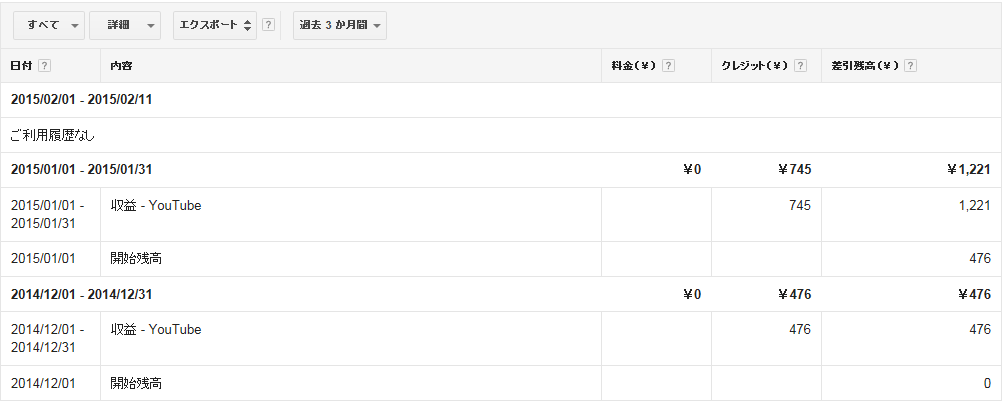 JUGEMテーマ:☆☆自宅でお小遣い稼ぎ☆☆ 12月から始めたYOUTUBEの収益化12月分の確定が1月11日だったので1月分もその辺かな?と思って張ってました( ´艸`)ムププそして2月12日今朝、反映されました!!今回の収益は745円!!こちらが証拠画像になりますw見えるでしょうか〜?これで合計1221円になりました( ´艸`)ムププはっきり言って・・・貼って放置のアフィリより成果出てるんですけど( ̄▽ ̄;)ただね今回は1回600円位の広告?が出たらしくて(詳しくはわからない)それがなかったら多分100円くらいだったかも(-_-;)私の動...