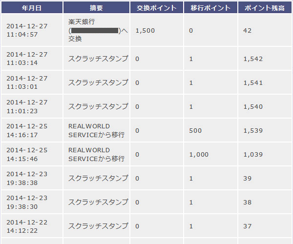年内最後の換金。 合計:1500円(これまでの換金総額:4000円) 楽天銀行の振込手数料で175ptひかれますので、正確には1325pt=1325円ですね。 前回11/29の換金報告でポイント残高は14ptでしたが、 毎日スクラッチでちびちび稼いでたのである程度増えてます。端数はそれです。 ほぼ毎日、げん玉のサービスと、PointExchangeでのスクラッチをして ポイントをためてますが毎日の作業時間は1時間くらい。 基本的にテレビを見ながら、音楽を聞きながらのながら作業なので、特に苦痛ではないです。 絶対毎日欠かさずやらな...