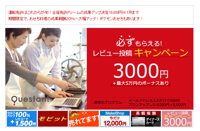 昨日たまたまA8.net のトップページで見つけたこの案件↓ A8.netのセルフバック 案件でした(スミマセン・・・登録しないと見れないみたい)気になったので覗いてみたところアンケートの作成をお手伝いするサービス?でしたレビューなら書けるかもととりあえず無料登録したんですが無料登録しただけで500円のセルフバックが発生するんです!500円ポッチなんて思う方もいらっしゃると思いますが貧乏専業主婦にとっては貴重です!!もちろんA8.net への登録が必要ですよ〜(登録無料) でもって500円のセルフバックで満足してしまい...