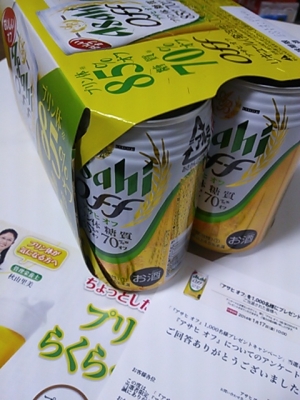 JUGEMテーマ:☆☆自宅でお小遣い稼ぎ☆☆タダを増やして、老後に備える、おっさんです。先日、アサヒ・オフが2本当たりました。実は、そこにはアンケートが一緒に入っていました。そのアンケートに応えた人には・・・なんとアサヒ・オフが6本必ず当たると書いてありました。早速、アンケートはがきに記入をして投函完了。そして、届きました! じゃじゃーん! やったね。