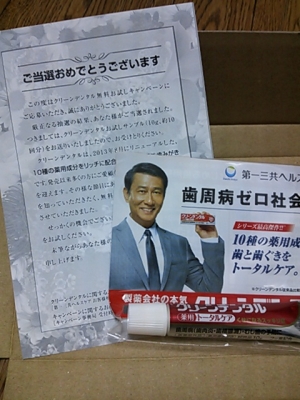 JUGEMテーマ:☆☆自宅でお小遣い稼ぎ☆☆おはようございます。タダを増やして、老後に備える、おっさんです。昨日のビールは嬉しすぎ!ビールとは別で、郵便受けにコレが届いていました。もらえれば何でもいいんです(笑)中井さん、あなたのような歯周病ゼロの歯を目指します。