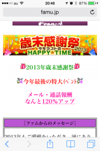 歳末感謝祭 今年ラストのHAPPYTIME 12月30日14:00〜31日23:59マデ Famu(ファム)とMocom(モコム)で 『歳末感謝祭』が行われております!! メール・通話報酬120%UPなので、参加しないなんて勿体無い!! と思っていたらなんと、、 「140%にさらにUPしました」というお知らせが 140%上がるとそれぞれの報酬は、 メール1件受信12p→17p 通常音声通話17p→24p その他、アプリ使用音声やTV電話ももちろんUPしております(ファムは年齢により違いがあります)。 今年少しでもお話してくれ...