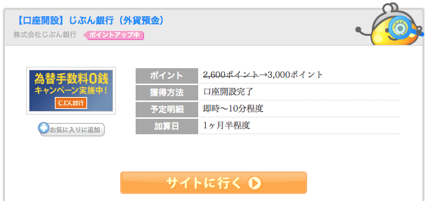 ポイントサイト「ちょびリッチ」のおすすめ案件です。 「じぶん銀行(外貨預金)」の口座開設だけで、今なら3,000ポイント(1,500円相当)もらえます! じぶん銀行はauが運営するサービスですが、au以外の方も利用可能です。 口座開設するだけで1,500円もらえるんですから、非常にお得です。 さらに入金(5,000円以上)もすれば2,000ポイント(1,000円相当)もらえますので、合計5,000ポイント(2,500円相当)もらえます!! ■ポイント獲得までの手順 1、口座...