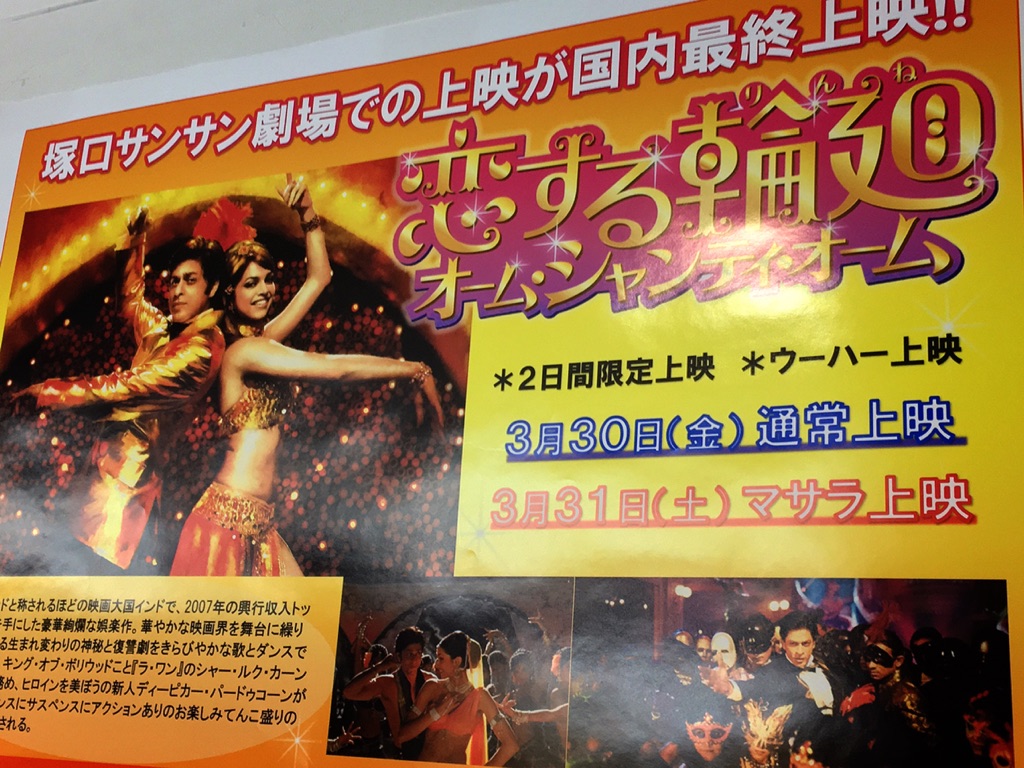噂に聞いていたマサラ上映を、 初体験してきました。 「恋する輪廻 オーム・シャンティ・オーム」。 派手派手な歌とダンスがしっかり組み込まれ、 主人公の女優さんが超美人な、 典型的なインド映画です。 劇場に入ると…、 結構な方がリピーターのようで、 サリーを着ている人多数。 そしてほとんどの方の手にタンバリンが。 そして映画の始まる前に、 一部のシーンがスクリーンに流れ、 ダンスの練習。 そして、そして、映画...
