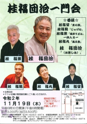 JUGEMテーマ:上方落語 12月は「大阪落語祭」 これは「大阪府文化芸術創出事業」ということで 「繁昌亭昼席」「動楽亭昼席」など、指定された寄席で 大阪府民であることを証明するもの (運転免許証・健康保険証・マイナンバーカードなど) を提示すると、木戸銭が所定の額から500円割引。 繁昌亭昼席なら 前売り¥2500→¥2000 今月、入院などがなかったら もう少しこの制度活用したかった・・・ 「大阪落語祭〜繁昌亭昼席公演・第725週1日目」 12月28日(月) 午後2時開演 一番太鼓は 桂弥壱(やいち)くん ...