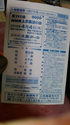 JUGEMテーマ:上方落語 このようなハガキがきました。 落語の公開録画って 往年の「枝雀寄席」以来ですな。 「第395回・NHK上方落語の会」 4月4日(木) 午後6時20分開演 NHK大阪ホール(地下鉄「谷町四丁目」下車) 座席数1417の大ホールです。 番 組 「みかん屋」 桂慶治朗 「写真の仇討」 桂 二乗 「妙齢女子の微妙なところ」桂あやめ 「富士の白雪」 桂 文福 中入り 「野崎詣り」 桂 福楽 「代書屋」 笑福...