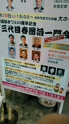 JUGEMテーマ:上方落語 「落語の街」を標榜する池田市が 街をあげて取り組む「春団治まつり」 そのメインがこの「三代目春団治一門会」です。 早くからチケット完売になる大イベントの招待券を 当会司之助代表が入手してくださいました。 さすがです。 「春団治まつり20周年記念・三代目春団治一門会」 4月28日(日) 15時開演 池田市民文化会館大ホール 一時間前から開場。すでに長蛇の列です。 「山内一豊と千代」 桂春蝶 この人がトップです。かなり「濃〜い」会 になりそうな予感。 「つる」...
