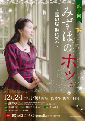 JUGEMテーマ:上方落語 というわけで 「第7回・みずほのホッ。〜露の瑞勉強会〜」 12月24日(月・祝) 午後2時開演 動楽亭 我ら「ミズホニスト」にとっては至福の日 「瑞ちゃんとすごすイブ」なのです・・・ 「御公家女房」 桂九ノ一 丸刈りが似合う青年。かの「九雀流延陽伯」を 愛弟子がさわやかに演じます。 「時うどん」 露の瑞 友人たちの結婚ラッシュ・・・披露宴に呼ばれると 友人代表で「大喜利」を始めるのですが・・・ 婚期を逃してるようですが、我々が居るよ!? 「バーテンダ...