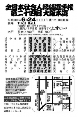 JUGEMテーマ:上方落語 というわけで、6月24日には この「選手権」と「美女と野獣の会」が 見事にバッティングしまして 最近の私、こういう場合は 「瑞ちゃん」をとることになってまして すみません。 年に一度の大イベントなんですが・・・ 今年は 浪漫亭不良雲さんが挑戦者の中での最優秀賞 で、優勝は 立の家猿え助さんの3連覇 おめでとうございます。 私が出場したのはもう9年前になります。 「こちら」
