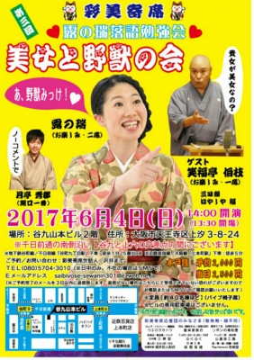 JUGEMテーマ:上方落語 昨年から開かれている 「彩美寄席世話人会」主催による 手作り感たっぷりの会です。 定員40名ほどの客席はほぼ満員です。 『第3回・彩美寄席 露の瑞落語会〜 美女と野獣の会』 6月4日(日) 14時開演 谷九山本ビル二階 「桃太郎」 月亭秀都 どうやら「国民の弟」らしい・・・ 「時うどん」 露の瑞 今回ネタおろし。かの「吉朝仕様」の「時うどん」 季節はずれながら、やっぱりうどんが食べたくなりますね。 「花筏」 笑福亭伯枝 今回の「野獣ゲスト」。相撲ネタがぴった...