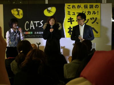 JUGEMテーマ:舞台鑑賞 ビッセで18時から行われるキャッツ出演俳優によるトークショーに行ってきました。 17時に仕事終わって10分後には着くから、コラボスイーツでも食べて待とうかな〜それとも座って本でも読んでようかな〜なんて行ってみたら既にイスは満席で人だかり!みなさん気合入ってますね…。 結局時間まで立って待ってました。 立見席2列目のセンターポジションだったので見やすかったです。でも携帯カメラだとぶれぶれー。 ディミータ役の旭川出身坂田加奈子さんと、ミストフェリーズ・タンブルブルータ...