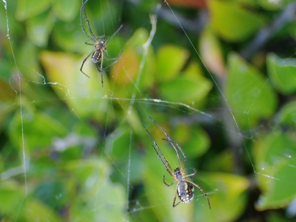 ウロコアシナガグモの交接を見かけました。 ウロコアシナガグモは冬の間も常緑樹の裏で越冬しているのをよく見かけます。 温かくなってから、夜には小さな網を張るようになりました。 キョウチクトウの葉裏で交接していたウロコアシナガグモのオスとメス。 2020.4.30.22:30前後 オスが触肢の先で何度もメスのお腹をなでていました。 オスの触肢の先が膨らむ瞬間。 オスはメスに食われてしまわないように、がっしりと鋏角で相手の鋏角を押さえ込んでいます。 ▼ 動画も撮ってみました。 ...