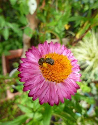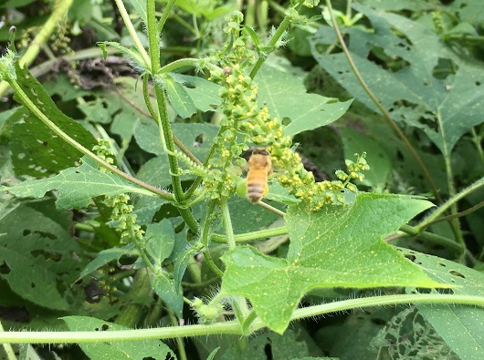 JUGEMテーマ:昆虫写真 この角度だとわかりにくいですが、お腹に花粉団子を付けた西洋ミツバチ。花粉団子は巣に貯えられて保存食となるようです。