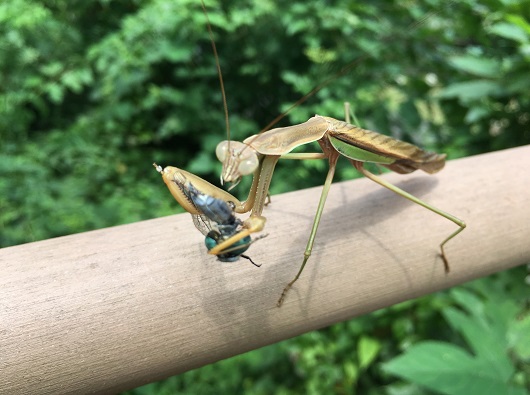 JUGEMテーマ:昆虫写真 お食事中のカマキリさん。共喰いすることもあるカマキリですが、交尾中にメスがオスを共喰いすることもあるそうです。