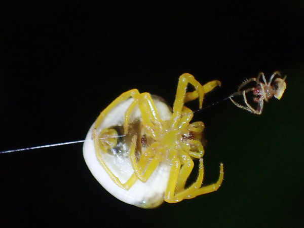 いつも見に行っている裏山のトリノフンダマシの続報です。 7月はまだ小さかったトリフンたちも、成体の立派な個体が増えました。 今週は、交接や卵のうを見ることができました。 ※ご参考 今年も近所のトリノフンダマシ(2017.7.28) トリノフンダマシが脱皮していました(2017.8.7.) 初めて見たトリノフンダマシの交接。 糸にぶら下がるメスにオスが近づきます。(2017.8.16. 20:50〜21:15撮影) メスが食事中とか脱皮中でもないのに、恐る恐る近づきます。 ギュッと触肢を1回だけ押しつけると、す...