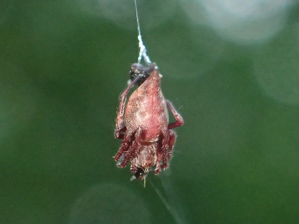 夜に見に行くと、いろんなクモが葉先から糸を渡してぶら下がっています。 極小サイズのクモがほとんどですが、アオオニグモのオスは体長5ミリぐらいあるので目立ちます。 雑木林の桜の葉先に糸を渡してぶら下がっていたアオオニグモのオスの成体。(2017.8.14.21:00) アオオニグモのメスやオスの亜成体は背中がつるっとしていますが、オスの成体はもこもこした感じ。 上のクモ、ゆらゆらして撮りにくいので、葉先に移動してもらいました。 上のクモより前に見たオスの成体。(2017.8.4.23:00) 同じ場所の少...