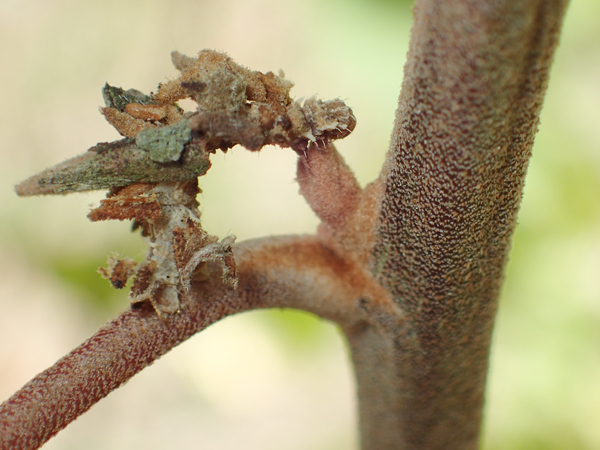 蜜腺から出る蜜以外に、今月見かけたアカメガシワを食糧にする虫たちをまとめてみます。 今月当ブログで取り上げた虫のなかで、蜜腺目的以外でアカメガシワに来ていたのは、樹液を吸うツマグロオオヨコバイと葉っぱをかじるサトクダマキモドキ。 アリたちは蜜腺の蜜をもらうことで、アカメガシワを食害する虫たちを牽制する役割を果たしているはずですが、ビリビリの葉っぱはたくさん見かけます。 枯れ葉をまとう尺取虫。アオシャクの仲間のようです。(2016.8.9.) 小さいのでゴミにしか見えません。 刺激してみたら...