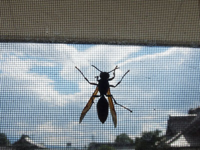 ある晴れた日。 窓を全開にして換気しようとした時、ガラスに何かがこつとぶつかる音がした。 ガラスと網戸の隙間に、活きの良いハチがいたのだった。 体長3cmのアシナガバチ。 いつ、どうやって入ったのか。 気付かずに開けてたかと思うと、恐ろしい! 大きな瞳に、ほっそりした足と腰のクビレ。 腕が1本折れてても気にしないサバサバ系。 でもオスなんだよなぁ。