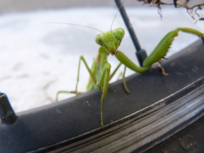 自宅の自転車のタイヤにいるカマキリと目があった! カマキリの性分として 動くものにはチョッカイを出さなばいられないので 息を殺して そぅ〜としばらく観察 両手をこするしぐさが お願い&お願い!って拝まれている様でかわいい〜 大きな目の中に瞳があり目があったと思いがち・・・ でも〜カマキリの黒目は 「偽瞳孔」と呼ばれる「見せかけの瞳孔」で カマキリ自身と目があった訳じゃぁないんだそぅです JUGEMテーマ:昆虫写真