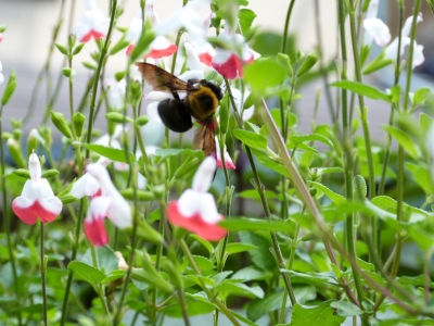 ブゥ〜〜ン ブゥ〜〜ン〜【 クマバチ 】見っけ! 昆虫にしては大音量の耳障りなホバーリング音をたて セッセセッセとホットリップス(紅白のサルビア)の 蜜集めに精を出してる働き者のクマバチ君 どう見ても航空力学上 無理無理飛んでいるとしか思えない! ずんぐりむっくり体系を飛ばせるには 羽が小さ過ぎるし 黄色の毛皮のベストは夏場には さぞかし暑かろう〜 JUGEMテーマ:昆虫写真