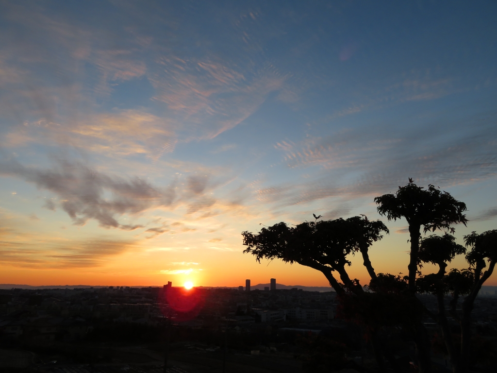 JUGEMテーマ:空の写真 伊丹空港の日の出フライトの写真です。エアフロントオアシス下河原付近から、撮影日は2019年1月元旦です。 朝もやの中に浮かぶ大阪市内のビル群(梅田方面よりはずっと東に振っている)、飛び立つ飛行機のシルエット、そして空の色のグラデーション。 朝焼けの中から水色の空へ。この色の連続性は、CGでは再現できない美しさです。 朝焼けの中飛び立つ飛行機と、背...