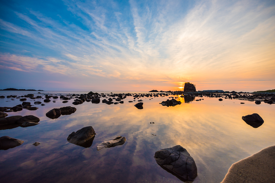 今日はどこで夕日を見ようかと、夫婦岩あたりを目指していたのですが、 その手前で美しい風景に出会い、浜へ下りました。 夕日が綺麗です。 片足が水没しました。 すべりそうな岩だったんですよ。そぉっと行けば大丈夫かな...なんて。 カメラは無事です。撮影続行です。 自分の作った波紋が、なかなか収まらず水面を揺らしています。 ...