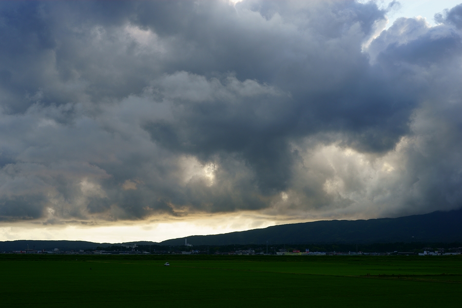 JUGEMテーマ:日常。JUGEMテーマ:カメラJUGEMテーマ:地域/ローカルJUGEMテーマ:癒しとやすらぎの自然・風景JUGEMテーマ:空の写真昨日の朝方はたいそうな雨が降ったんですが、その後は何とか持ちこたえました。この時期らしい蒸し暑い天気でしたが、夕方には広い青空と、“雲らしい雲”が広がっていました。【α99】+【50mm F1.4】-- 50mm 1/125sec F11.0 ISO=100 多分割測光 WB=曇天 --昨日は仕事の関係で羽茂方面へ行っていました。帰り道、国仲平野の国府川沿いの農道に車を止めました。北西の外海府方面の上空には不穏な雲が迫って...