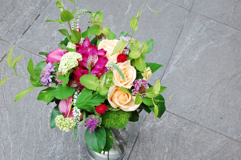 JUGEMテーマ:flower* ◇本日のブーケ どんよりとした天気だったので、明るい気分になる花束に。 使用した花材は、バラ・アルストロメリア・スノーボール・カラー・スカビオサ・ベロニカ・センニチコウ・テマリソウ・リキュウソウ・アップルミント・レモンリーフの11種類です。 明日17日は父の日ですね。 だいすきなお父さんの為に花束を買いにきてくれた小さなお客様にほっこりとした1日でした。 フローリスト花成 小川