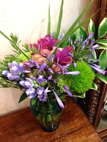 JUGEMテーマ:flower* じゃーん!! 紫と、赤紫色が緑に映えますーー 早速、詳細を アガパンサス 私の好きなマリモ=テマリソウ 真ん中⇒リンドウ 一番奥がナルポラン こちらは大集結してますが 手前から黄緑色のカーネーション 右下の葉っぱ→ドラセナ(今回はちょっと形を変えての登場です!) その上ピンクの菊→マム お隣左はクルクマ 今回もお花パワーに癒されているPure Soulでした。 ★ Pure Soul ★ facebookもやってます http://t.co/mgRE2Oea...