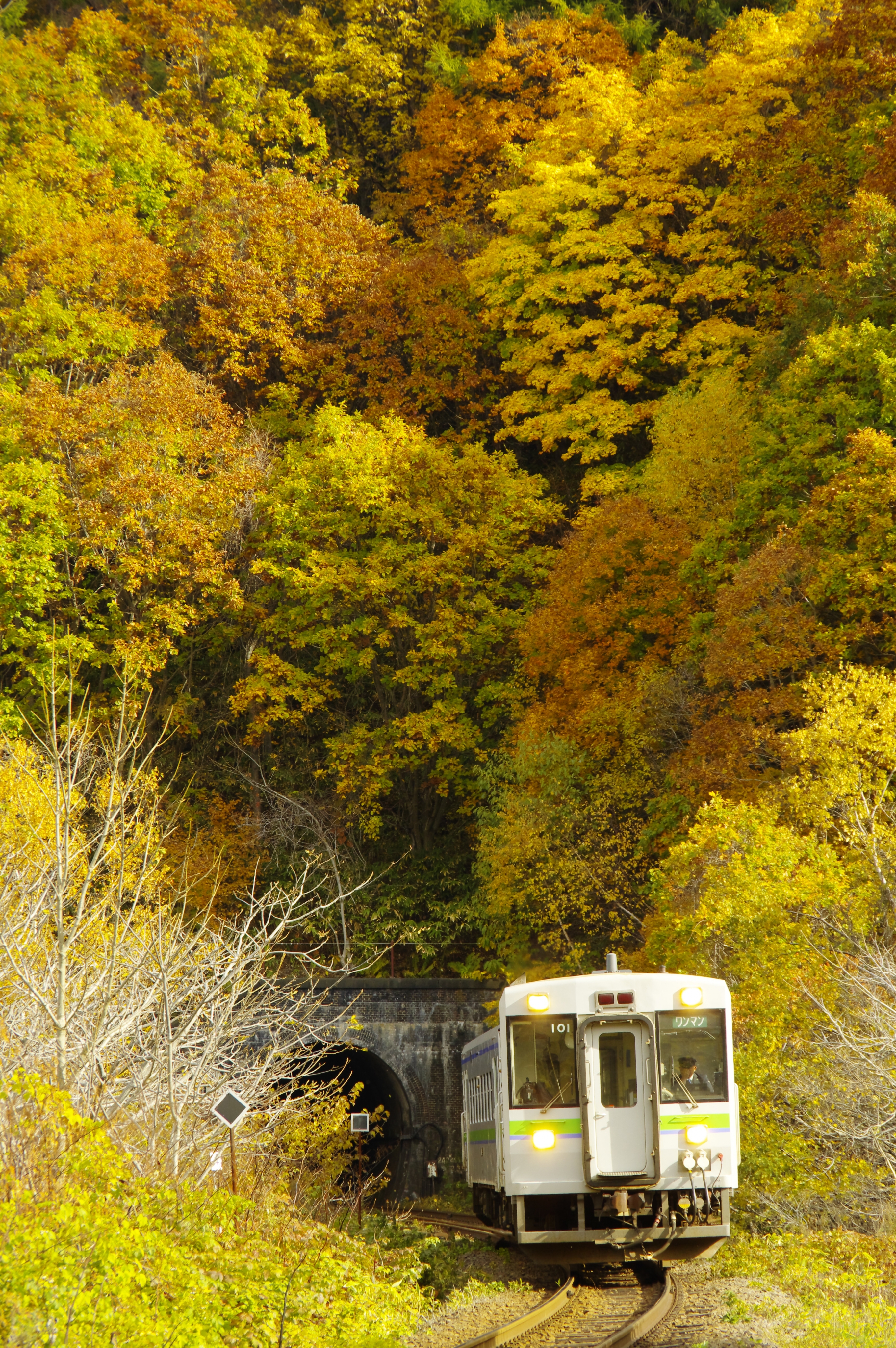 JUGEMテーマ:鉄道写真 こんにちは! 10月26日はお買い物に行く前に函館本線山線・塩谷−蘭島間にある「桃内トンネル」から飛び出してくる列車を撮ってきました。愛息を抱っこして撮るので三脚とレリーズをセットして1934Dを待ちます。 F8.0、1/800秒、ISO800、150mm、露出補正±0、WB 曇天、カスタムイメージは「風景」で撮影。1934Dはキハ150の2両編成、トンネルを包む山は見事な紅葉でした。例の如く愛息は抱っこされながら声を上げて...