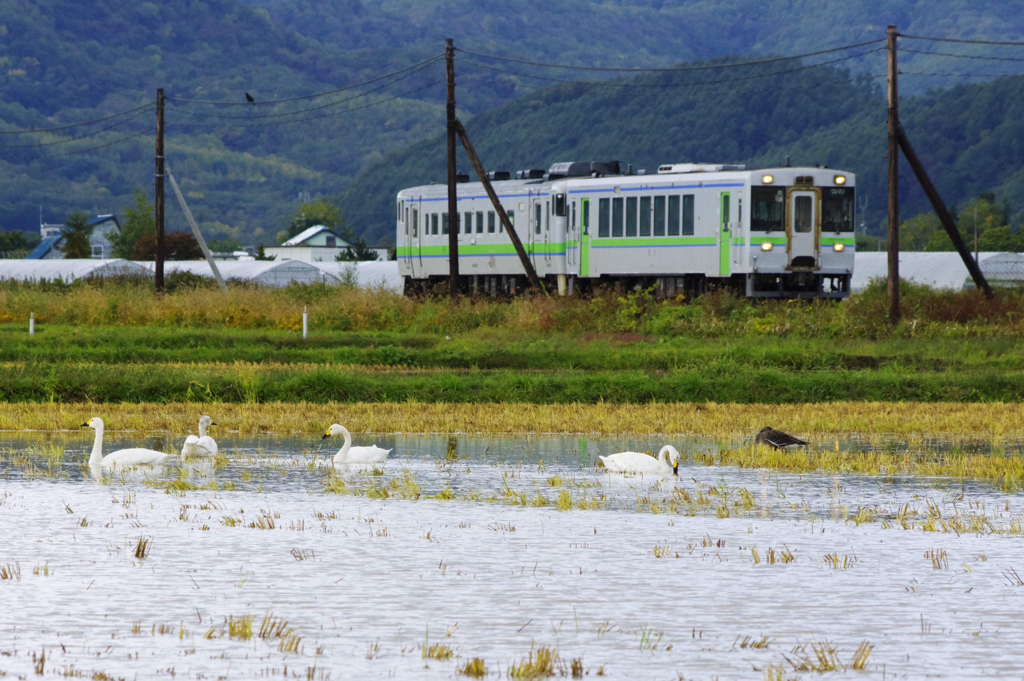 JUGEMテーマ:鉄道写真 こんにちは! 愛馬ブラストワンピースが凱旋門賞に出走する10月6日の朝は、時折、小雨がパラついたりする生憎のお天気でしたが、そんなことは気にせずにいつもの仁木−余市間の撮影ポイントへ愛息と2人で行って来ました。 前日からの雨の影響で水がたまった畑に何か大きな白い物体がいるな〜と思ったら、その白い物体は驚くことに白鳥でした。羽を休めていたんですね。 F11、1/800秒、ISO1600、255mm、露出補正±0、WB AWB、カスタ...