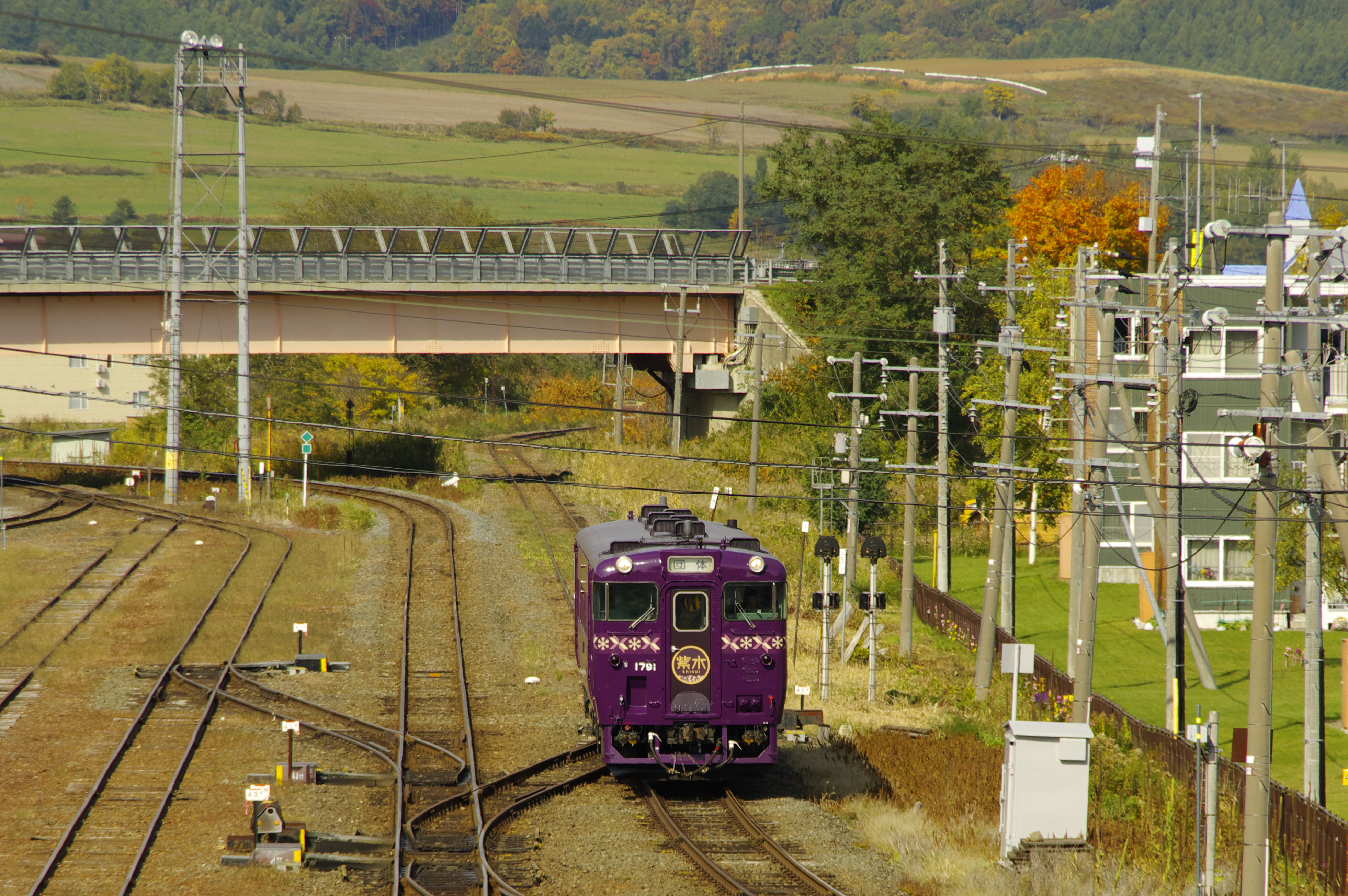 JUGEMテーマ:鉄道写真 こんにちは! 昨日、10月14日は「鉄道の日」でした。その「鉄道の日」に合わせて、JR北海道の観光列車 キハ40-1791 『紫水号』が一般公開され、その後、旭川−富良野間を往復運行しました。 この運行に合わせて休みを取得していたので、家族3人で紅葉ドライブも兼ねて富良野へと車を走らせました。まずは富良野駅近くの跨線橋から富良野駅に入線する『紫水号』を撮影しました。 F8.0、1/800秒、ISO200、202mm+トリミング、露出補正&plusm...