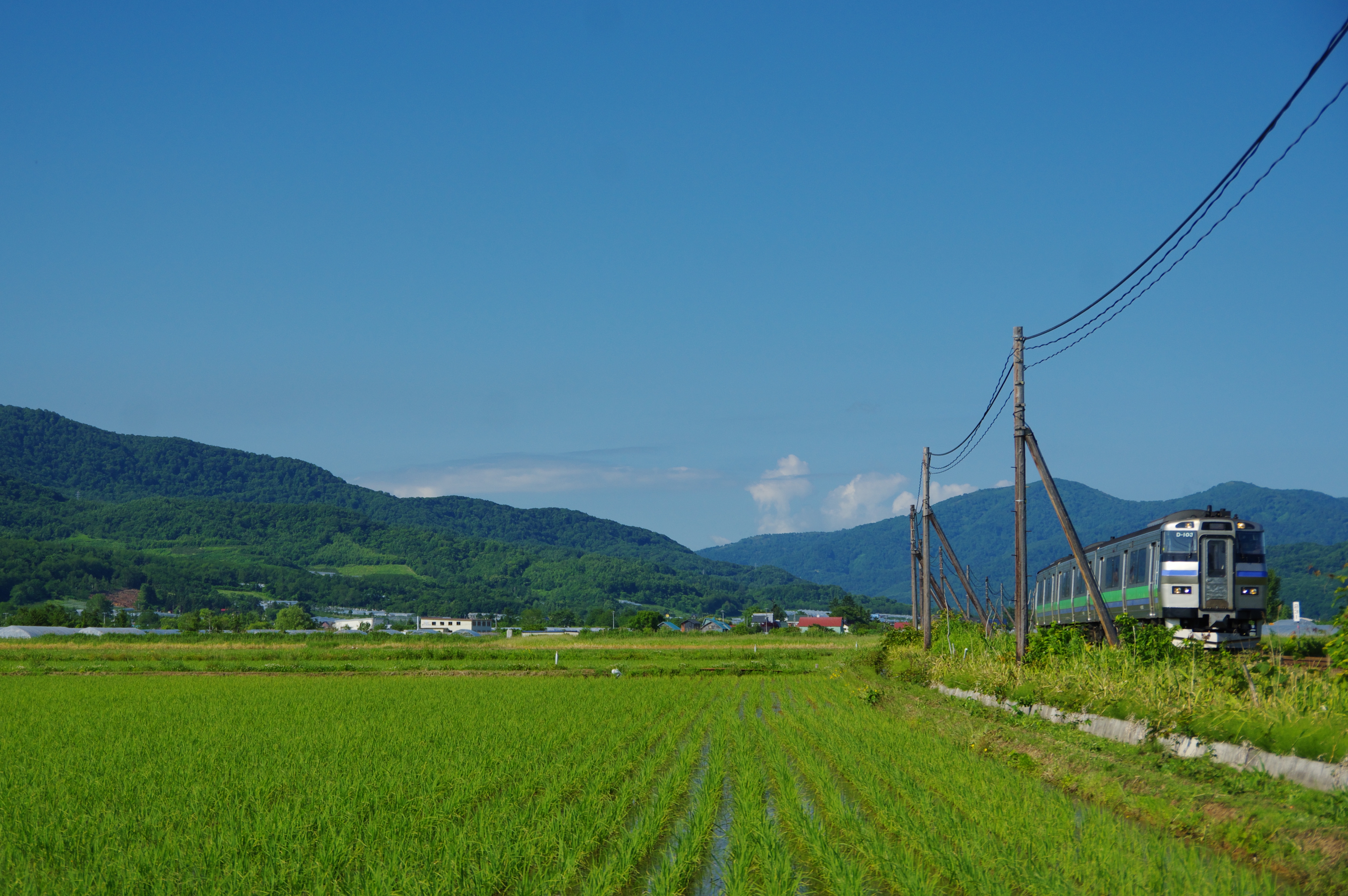 JUGEMテーマ:鉄道写真 こんにちは! 昨日も朝は快晴で、2日続けてかなりの好天に恵まれました。この日は愛息にしては珍しく6時過ぎまで寝ていました。そうなるといつも撮っている963Dに間に合わせるにはちょっと時間が足りないか… でもせっかく愛息に朝早くから叩き起こされているのですから、キハ201を撮りに行かないのはもったいないということで、963Dの1本後、3925D・快速ニセコライナーを撮りに仁木−余市間の水田ポイントにやって来ました。 現地に到着するや否や踏切が鳴り...