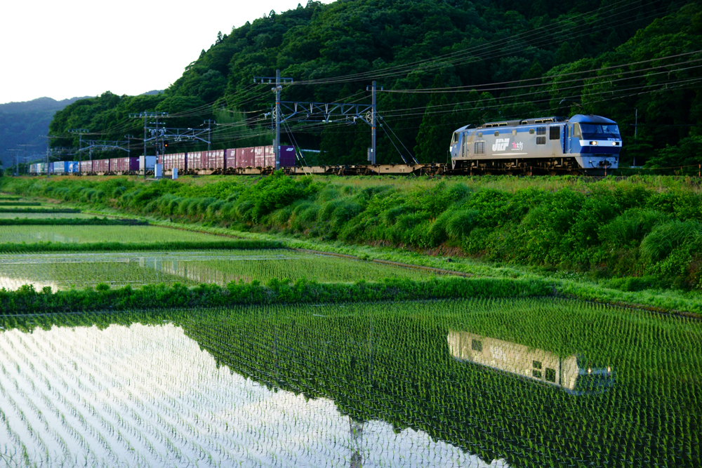 JUGEMテーマ:鉄道写真 日が差し込み始め、列車を照らすようになってきたところに丁度列車がやってきました。 風が吹いているのですが、意外と水面は波立たずでした。 少し稲が伸びて来ましたが十分映える姿を見せました。