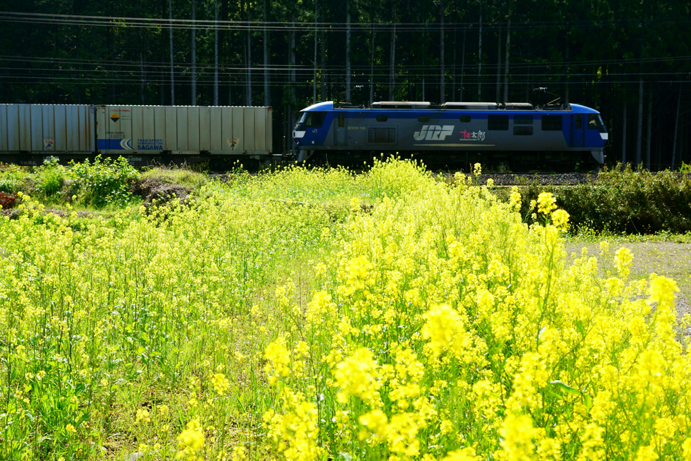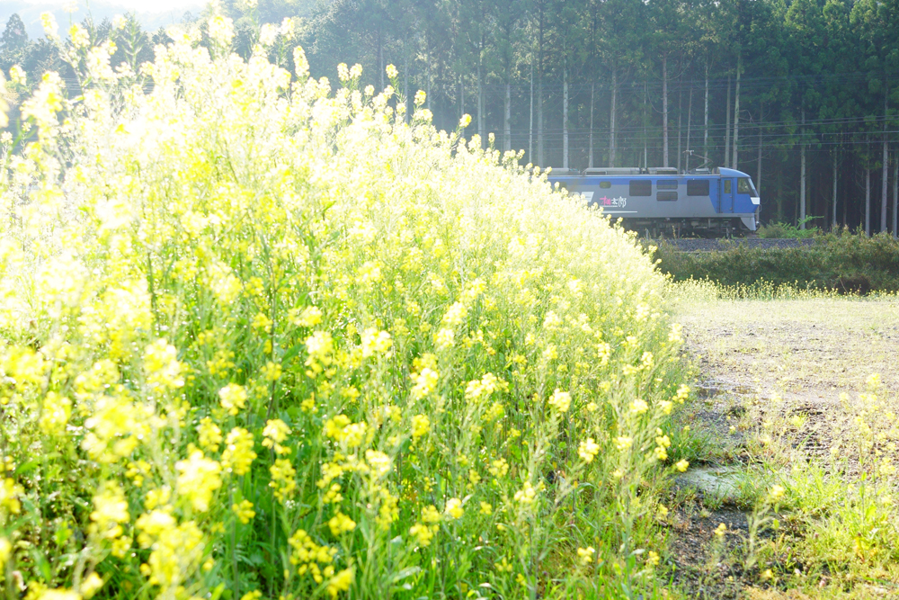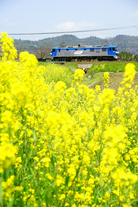 JUGEMテーマ:鉄道写真 たくさんの菜の花がが帯のように並びまるでカーテンのように見えます。 そこから少し顔をだすカマのすがたを捉えてみました。