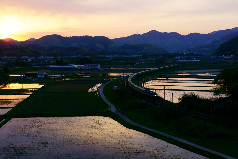 JUGEMテーマ:鉄道写真 田植えの時期は、上から見ると鏡のように空を映してくれます。 日の出の前後で微妙に色が変わっていく姿がとても美しくて、毎年行くようにしています。日が昇って程なく、すぐに福山ライナーが通過していきます。
