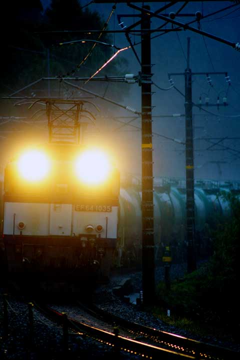 JUGEMテーマ:鉄道写真 降りしきる雨の中で、ライトに光ったレールと架線をイメージしながら、 列車を待っていると後方から電車が近づいて来ました。 かぶる!と思いながら通過した後でなんとか撮ることができました。