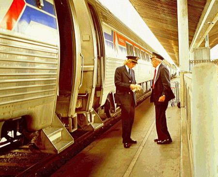 JUGEMテーマ:鉄道写真 プラットホームで打ち合わせをしている鉄道員(車掌?)たちの情景を、CGアートで描いています。 写真ではないのですけれど、鉄道関連と云う1枚です。 鉄道の駅は、国によって雰囲気だけではなく駅舎の設計そのものが異なっているという特色がございます。 アメリカは始発駅でもプラットホームは地表レベルと同じ高さ。 この絵のように、乗客はステップを上って列車に乗り込むということになります。 ドイツやフランスの地方の駅でも、地面から列車へ上るというのは映画などでも目にいたしますけ...