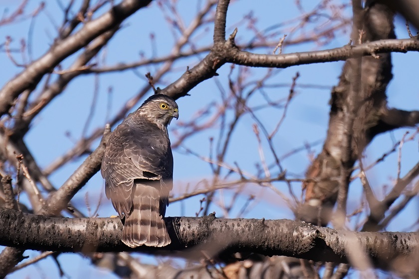 鳥見シーズン真っただ中ではありますが前代未聞の鳥枯れ状態のホームグラウンド。 元気なのは「猛禽3兄弟」だけ。この2日間も3兄弟のオオタカ・ハイタカ・ノスリが 飛び回りやりたい放題の状況です。 朝一のハイタカとまりもの。 ノスリも大空に悠々と現れます。 オオタカが獲物を狩り地上で絞め。 更に獲物を樹上で解体・捕食。 人が近づいたら獲物を持って大空へ。 獲物の体と脚が黒いようで...