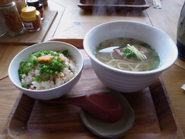 JUGEMテーマ:RICOH GR digital 3 昼ごはんは、那覇の麺処てぃあんだーで半そばとジューシーのセット550円。 最近はラーメンメニューばかり頼んでしまってましたが、やっぱり美味しい基本の沖縄そば。 自家製麺もさることながら、とにかく出汁が美味すぎる!セットのジューシーもいい感じです。 半そばなので女性にはぴったりのサイズかも。