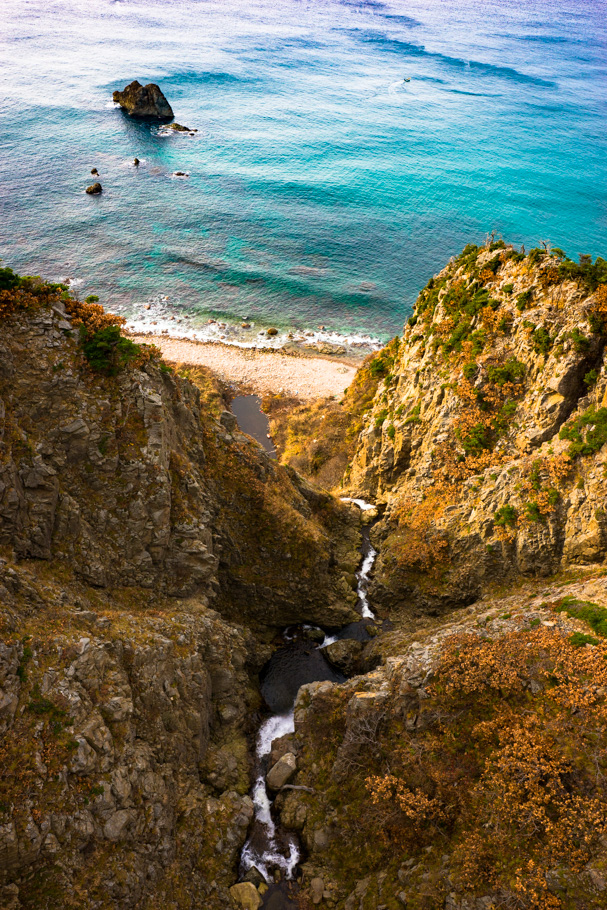 大ザレ渓谷です。 そしてこちらは、そこに架かる「海府大橋」からの眺めです。 【α99,Vario Sonnar T* 24-70mm F2.8 ZA SSM,1/50,F11,iso200】 足元をのぞき込むと、流れ落ちる大ザレ川が見えます。 国土地理院の地形図から察するに、橋から川までの高さは約50m。 そこから海面の高さまでは約50mほどありそうです。 川の流れ落ちる先には「大ザレ滝」が落ちていますが、ここからは見えません。 【α99,70-300mm F4.5-5.6 G SSM,1/100,F11,iso200】 ...