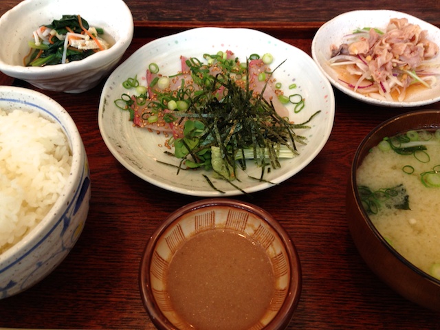 JUGEMテーマ:iPhone 5 昼ごはんは、博多もと山で「かんぱち刺丼定食」880円。 丼と言いながらも、刺し身が別添です。 新鮮なかんぱちにゴマ醤油をつけていただきます。 今日もついついご飯を食べ過ぎる。