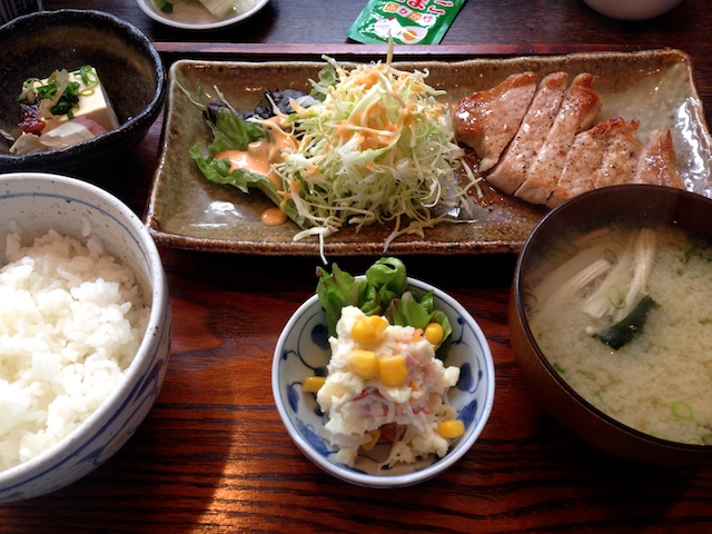 JUGEMテーマ:iPhone 5 昼ごはんは、連日のもと山へ。 本日は、豚ロースバター醤油定食780円。 香ばしく焼かれた豚ロースは柔らかくてとっても美味しい。 そして小鉢のポテトサラダがこれまたうまい! 冷奴かと思いきや、温かい湯豆腐だったりするところがまた心憎い。 いや〜今日も素晴らしい。